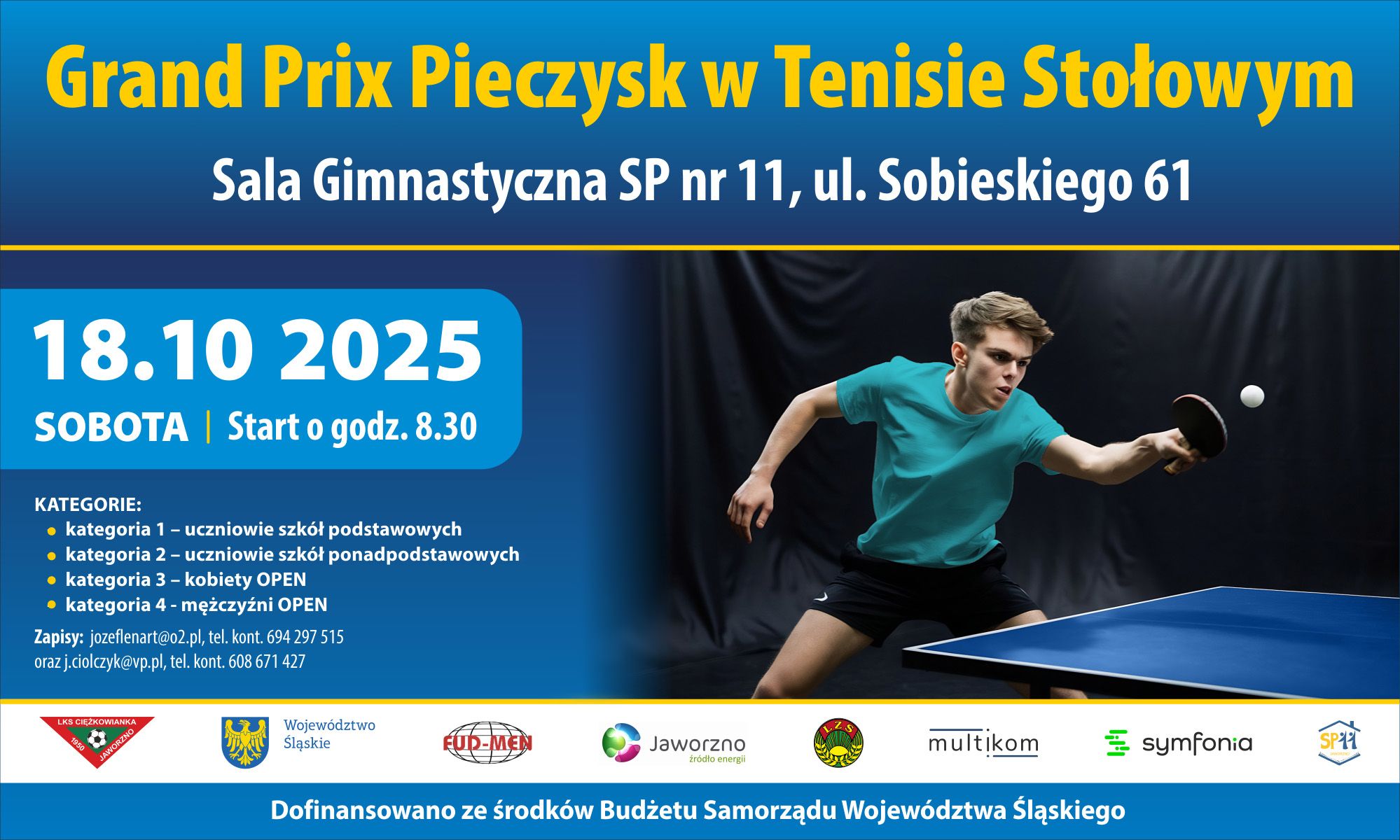 W sobotę 18 października 2025 roku na sali gimnastycznej Szkoły Podstawowej nr 18 w Jaworznie odbył się Turniej Grand Prix Pieczysk w Tenisie Stołowym. Organizatorzy: LKS”Ciężkowianka” Jaworzno, Śląskie Wojewódzkie Zrzeszenie Ludowe Zespoły Sportowe, Samorząd Województwa Śląskiego oraz Gmina Jaworzno.